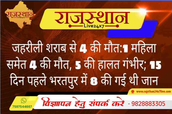 जहरीली शराब से 4 की मौत:1 महिला समेत 4 की मौत, 5 की हालत गंभीर; 15 दिन पहले भरतपुर में 8 की गई थी जान