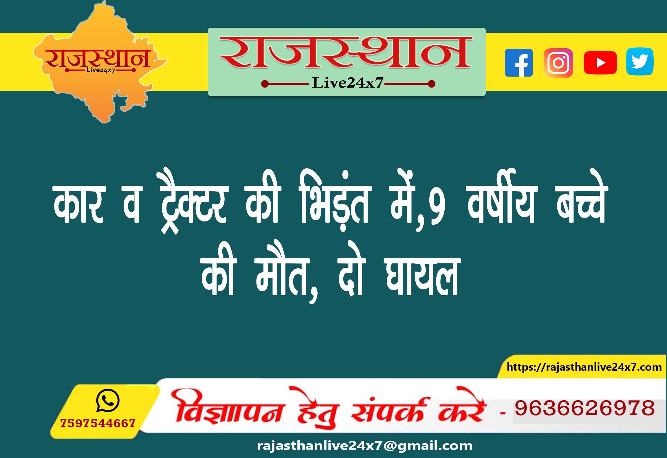 कार व ट्रैक्टर की भिड़ंत में,9 वर्षीय बच्चे की मौत, दो घायल