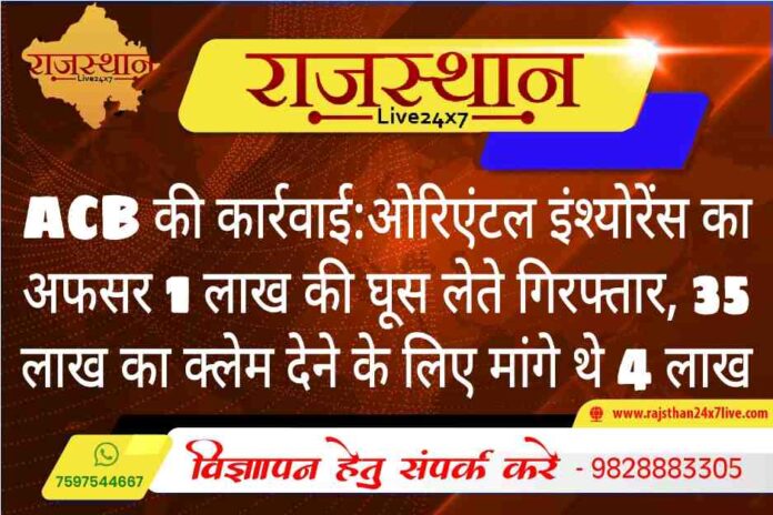 ACB की कार्रवाई:ओरिएंटल इंश्योरेंस का अफसर 1 लाख की घूस लेते गिरफ्तार, 35 लाख का क्लेम देने के लिए मांगे थे 4 लाख
