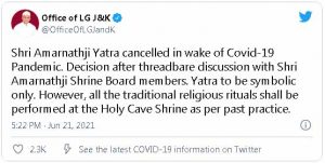 नई दिल्ली। कोरोना की महामारी का प्रकोप बाबा अमरनाथ की यात्रा पर भी पड़ गया है। जिसके चलते वर्ष 2021 की अमरनाथ यात्रा को लगातार दूसरे साल भी रद्द कर दिया गया है। इसकी जानकारी जम्मू कश्मीर के उप राज्यपाल के कार्यालय ने जारी की है।