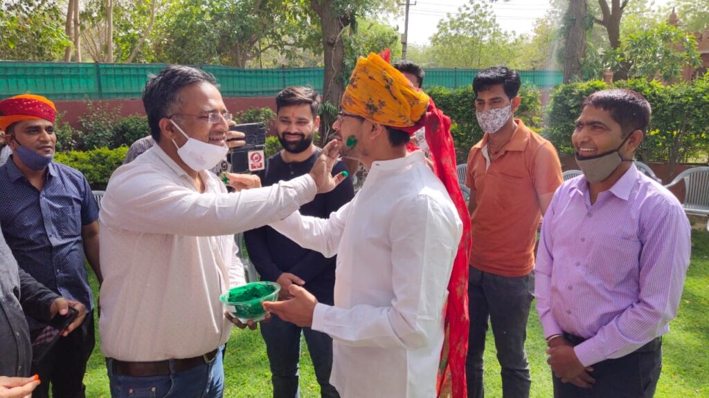 जिला कलक्टर नमित मेहता के आवास पर मनाया होली का त्योहार उत्साह के साथ मनाया गया। इस मौके पर कलक्टर मेहता ने गुलाल लगाई, चंग बजाया और डांस भी किया। कार्यक्रम में बाबूलाल छंगाणी ने चंग पर खूब धूम मचाई। जिला कलक्टर के परिजनों ने भी बीकानेर की सतरंगी संस्कृति देखी। इस दौरान अनेक प्रशासनिक अधिकारी, प्रेस प्रतिनिधि और आमजन मौजूद रहे।