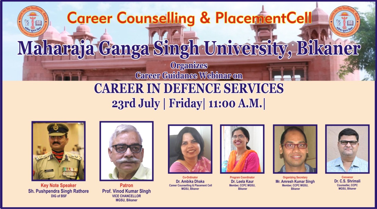 बीकानेर। एमजीएस विश्वविद्यालय, बीकानेर के कॅरिअर काउंसलिंग एण्ड प्लेसमेंट सेल द्वारा विद्यार्थियों के कॅरिअर मार्गदर्शन के लिए दिनांक 23 जुलाई 2021 को सुबह 11.00 बजे आॅनलाइन माध्यम से ’कॅरिअर इन डिफेंस सर्विसेज’ विषय पर वेबिनार का आयोजन करने जा रहा है। इस वेबिनार में बीएसएफ के उप महानिरीक्षक क्षेत्रीय मुख्यालय श्री पुष्पेन्द्र सिंह राठौड़ की-नोट स्पीकर के रूप में विद्यार्थियों को डिफेंस सर्विसेज में कैसे कॅरिअर बना सकते हंै, उसकी जानकारी देंगें। कार्यक्रम की अध्यक्षता विश्वविद्यालय के सम्मानीय कुलपति प्रो. विनोद कुमार सिंह करेंगें।