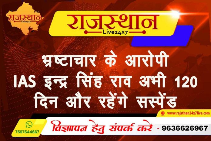 रिश्वत के आरोप में गत वर्ष 23 दिसंबर को गिरफ्तार हुए आईएएस इंद्रसिंह राव की मुश्किलें कम नहीं हो रही है. करीब 4 महीने पहले 5 फरवरी को राज्य सरकार ने आईएएस राव की निलंबन अवधि 120 दिन यानी 4 महीने और बढ़ा दी थी. निलंबन की यह अवधि अब समाप्त हो रही थी. राज्य सरकार के कार्मिक विभाग ने इंद्रसिंह राव की गिरफ्तारी के बाद 4 जनवरी को निलंबित करने के आदेश जारी किए थे. इसमें यह निलंबन 23 दिसंबर से होने का हवाला भी दिया गया थाl