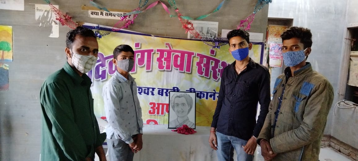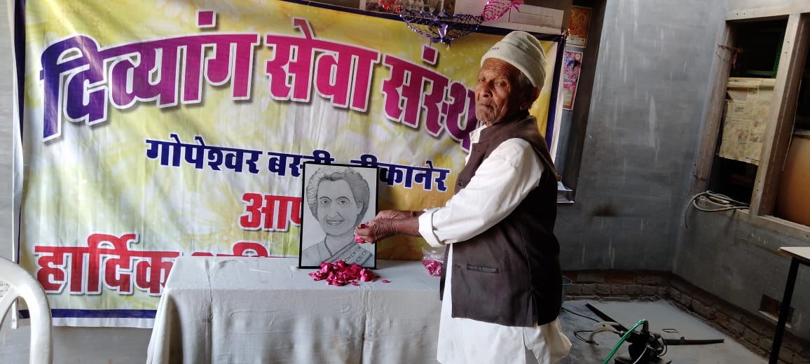 आज दिव्यांग सेवा संस्थान में भारत की प्रथम महिला प्रधानमंत्री इंदिरा गांधी जयंती मनाई गई इस अवसर पर मोहल्ले के वरिष्ठ नागरिक ने पुष्प अर्पित कर नमन किया।अध्यापक टीकू राम खजोड़ा के कहाँ की इनका मोहनदास करमचंद गाँधी से न तो खून का और न ही शादी के द्वारा कोई रिश्ता था। इनके पितामह मोतीलाल नेहरू एक प्रमुख भारतीय राष्ट्रवादी नेता थे। इनके पिता जवाहरलाल नेहरू भारतीय स्वतंत्रता आन्दोलन के एक प्रमुख व्यक्तित्व थे और आज़ाद भारत के प्रथम प्रधानमंत्री रहे।
