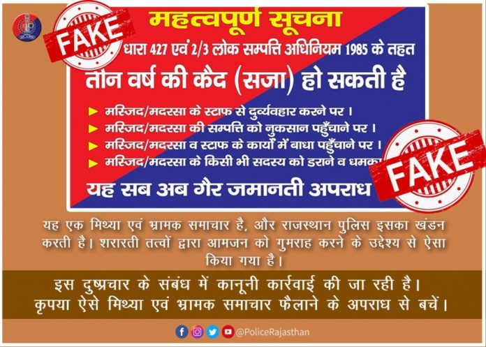 सोशल मीडिया पर इन दिनों फेक खबर और जानकारी शेयर कर कुछ असामाजिक तत्व सांप्रदायिक सौहार्द बिगाड़ने और समाज में भ्रम फैलाने का काम कर रहे हैं। बीते कुछ दिनों से राजस्थान में विशेषकर उदयपुर जिले में सोशल मीडिया पर एक फेक जानकारी साझा की जा रही है जिसमें भारतीय दंड संहिता की का उल्लेख करते हुए बताया गया है कि मस्जिद व मदरसा की संपत्ति को नुकसान पहुंचाने व मस्जिद व मदरसा के स्टाफ को धमकाने या दुर्व्यवहार करने पर 3 साल की सजा हो सकने का दावा किया गया है।