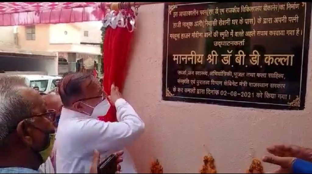 बीकानेर, 2 अगस्त। ऊर्जा तथा जन स्वास्थ्य एवं अभियांत्रिकी मंत्री डॉ. बी.डी. कल्ला ने सोमवार को एस.डी.एम. राजकीय जिला चिकित्सालय में नवनिर्मित आपातकालीन भवन का उद्घाटन किया। इस भवन का निर्माण हाजी माशूक अली द्वारा अपनी पत्नी मरहूमा हाजन मोबिना बानो की स्मृति में लगभग 15 लाख रूपए की लागत से करवाया गया है।