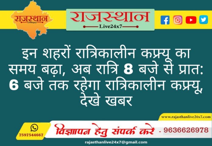प्रमुख सचिव गृह अभय कुमार ने कोरोना की दूसरी लहर के प्रसार को रोकने के लिए राज्य सरकार द्वारा जारी दिशा निर्देशों की जानकारी दी। उन्होंने बताया कि अजमेर, अलवर, भीलवाड़ा, चित्तौडगढ़, डूंगरपुर, जयपुर, जोधपुर, कोटा एवं आबूरोड की नगरीय सीमा में रात्रि 8 बजे से प्रात: 6 बजे तक रात्रिकालीन कफ्र्यू रहेगा। इसके लिए बाजार एवं व्यावसायिक प्रतिष्ठान रात्रि 7 बजे बंद कर दिए जाएंगे। उदयपुर में बाजार एवं प्रतिष्ठान शाम 5 बजे बंद होंगे।