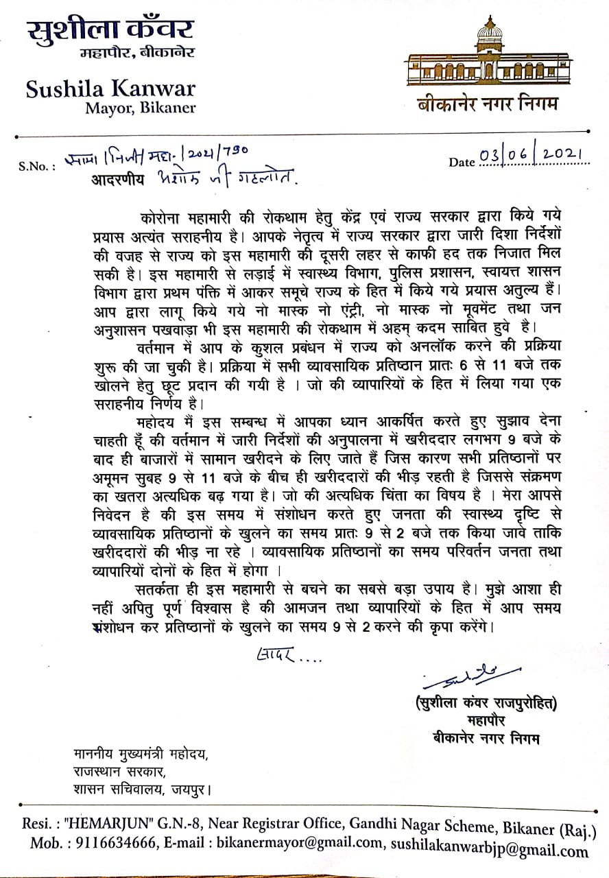 महापौर सुशीला कंवर ने मुख्यमंत्री अशोक गहलोत को जनहित में सभी के स्वास्थ्य दृष्टि से व्यापारिक प्रतिष्ठानों के खुलने के समय में संशोधन कर समय 9 से 2 बजे तक करने हेतु लिखा पत्र।