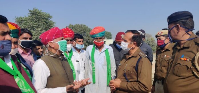 हरियाणा सीमा पर बिगड़ते माहौल के बीच महापंचायत के राष्ट्रीय अध्यक्ष रामपाल जाट शाहजहांपुर के घिलोठ औद्योगिक क्षेत्र को जाने वाले दो सौ फिट रोड पर रीको गेट के पास अपने समर्थकों को साथ लेकर बैठ गए। इस दौरान मौके पर तैनात नीमराणा एसडीएम योगेश देवल, डीएसपी लोकेश मीणा और थाना प्रभारी सुनील जांगिड़ ने जिले में लगी 144 धारा का हवाला देकर उन्हें रीको गेट से हटा दिया। इसके बाद महापंचायत से जुडे़ किसान समीप ही कृषि कॉलोनी की जगह में पड़ाव डाल कर बैठ गए। प्रशासन उनको वहां से हटाने के लिए समझाइश में लगा हुआ है।