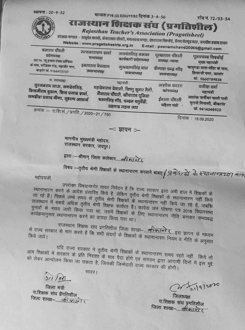 बीकानेर 21 सिंतबर 2020, राजस्थान शिक्षक संघ प्रगतिशील के प्रदेश आह्वान पर आज राजस्थान के सभी 33 जिलों में तृतीय श्रेणी शिक्षकों के स्थानांतरण को लेकर मुख्यमंत्री को जिला कलेक्टर के माध्यम से ज्ञापन का कार्यक्रम रखा गया है। इसी क्रम में बीकानेर जिले में प्रदेश महामंत्री यतीश वर्मा के नेतृत्व में आज अतिरिक्त कलेक्टर गोरी जी को ज्ञापन दिया गया।*जिलाध्यक्ष आनंद पारीक के अनुसार जिले में धारा 144 लगी हुई है इसको ध्यान में रखते हुए बहुत कम लोगो को ही इसमे ज्ञापन देने में शामिल किया गया। साथ ही पारीक ने बताया कि राज्य सरकार द्वारा प्रदेश के सभी विभागों के कर्मचारियों सहित शिक्षकों के प्रधानाचार्य, व्याख्याताओ,वरिष्ठ अध्यापको के स्थानांतरण ऑनलाइन आवेदन मांगे गए है लेकिन तृतीय श्रेणी अध्यापक ओर प्रबोधकों को आवेदन से वंचित किया गया है जिसका संघठन विरोध करता है।। जिलामंत्री गोविंद भार्गव के अनुसार राज्य में सात लाख कर्मचारी है जिसमे ढाई लाख तृतीय श्रेणी अध्यापक ओर प्रबोधक है इनका विगत कई वर्षों से स्थानांतरण नही हुआ है। सभाध्यक्ष सुभाष आचार्य ने कहा कि वर्षो से इंतजार करते हुए अपने गृह जिले में जाने को आतुर है,डार्क जोन,प्रतिबंदित जिलों में पदस्थापित है वे स्थानांतरण चाहते है। प्रदेश सलाहकार मोहम्मद इलियास जोइया ने कहा कि कई विधवा,एकल महिला,विकलांग, परितग्यता महिला शिक्षिकायें,गंभीर बीमारियों से ग्रषित शिक्षक अपने घर के जिलों से दूर पदास्थापित है वे निराश हो गए है। प्रतिनिधि मंडल में आनंद पारीक,यतीश वर्मा, सुभाष आचार्य,गोविंद भार्गव ओर मोहम्मद इलियास जोइया सामिल थे।