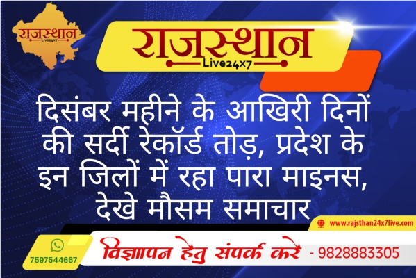 प्रदेश में दिसंबर महीने के आखिरी दिनों की सर्दी रेकॉर्ड तोड़ रही है। बुधवार को चूरू में पिछले 46 साल का दिसंबर महीने का रेकॉर्ड टूट गया। 1973 के बाद दिसंबर में इस साल न्यूनतम तापमान में सर्वाधिक गिरावट दर्ज की गई। 1973 में चूरू में दिसंबर का न्यूनतम तापमान माइनस 4.6 डिग्री दर्ज किया गया था। इससे पहले 2011 में दिसंबर में माइनस 1.4 डिग्री दर्ज हुआ। इसके बाद बुधवार को पारा माइनस 1.5 डिग्री दर्ज हुआ। वहीं, प्रदेश में लगातार दूसरे दिन माउंट आबू में तापमान माइनस 4 डिग्री दर्ज किया गया। फतेहपुर में माउंट आबू के बाद पारा माइनस तीन डिग्री पर रहा। वहीं, जयपुर का जोबनेर दूसरे दिन भी मानइस में रहा। प्रदेश में चार जगहों पर तापमान माइनस में रहा। इसके अलावा पिलानी में न्यूनतम तापमान 0.5 डिग्री रहा। 16 शहर पांच डिग्री से नीचे रहे। 24 घंटे में मौसम बदलेगा