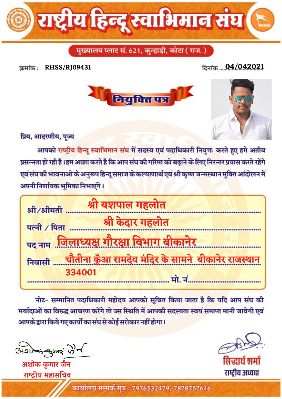 राष्ट्रीय हिन्दू स्वाभिमान संघ RHSS की युवा शाखा गौरक्षा विभाग पर बीकानेर के यशपाल गहलोत बने अध्यक्ष राष्ट्रीय हिन्दू स्वाभिमान संघ RHSS की युवा शाखा गौरक्षा विभाग के बीकानेर में जिला अध्यक्ष पद पर अरविंद वैष्णव द्वारा यशपाल गहलोत की नियुक्ति की गई जिसमें बजरंगलाल बिशनोई, विजेन्द्र भाटी ओर समस्त पदाधिकारी की उपस्तिथि रही।
