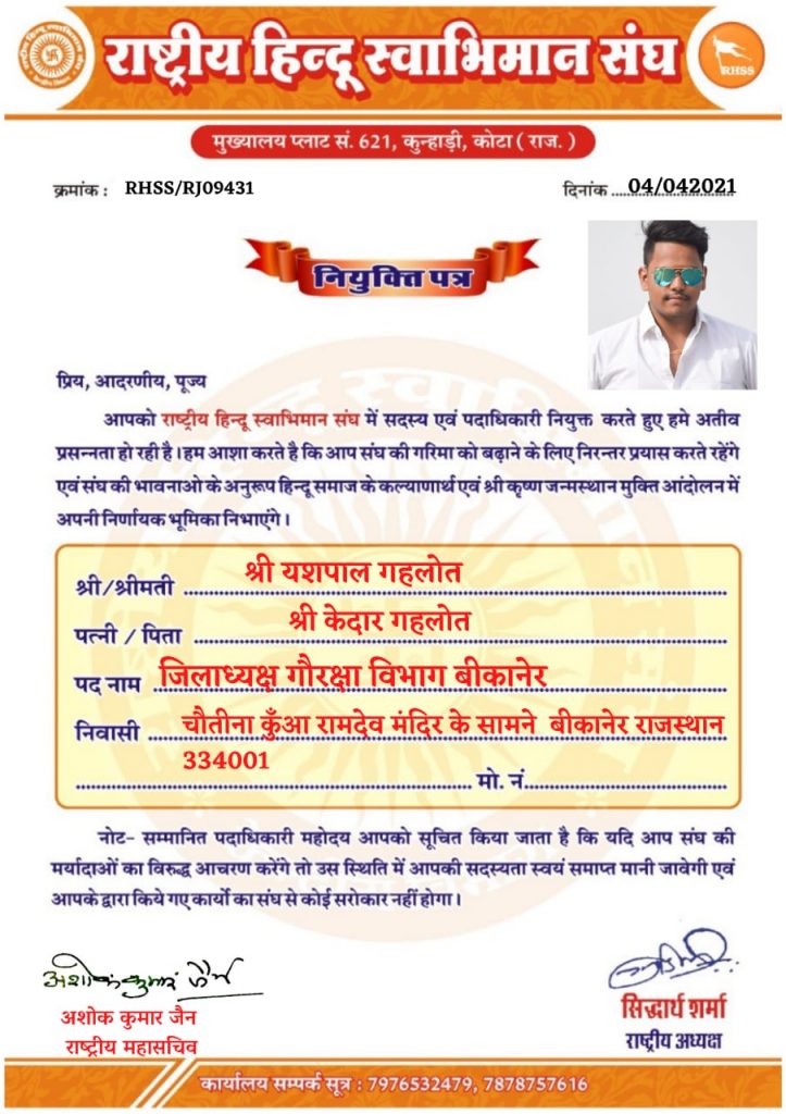 राष्ट्रीय हिन्दू स्वाभिमान संघ RHSS की युवा शाखा गौरक्षा विभाग पर बीकानेर के यशपाल गहलोत बने अध्यक्ष